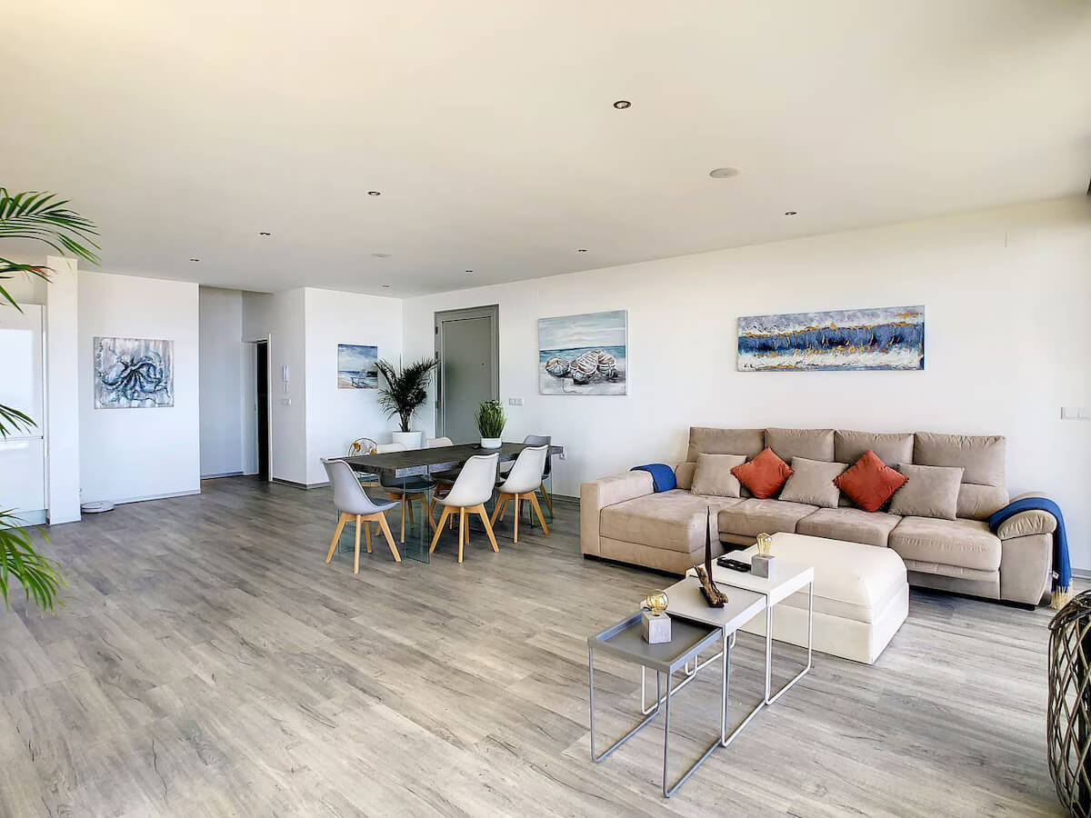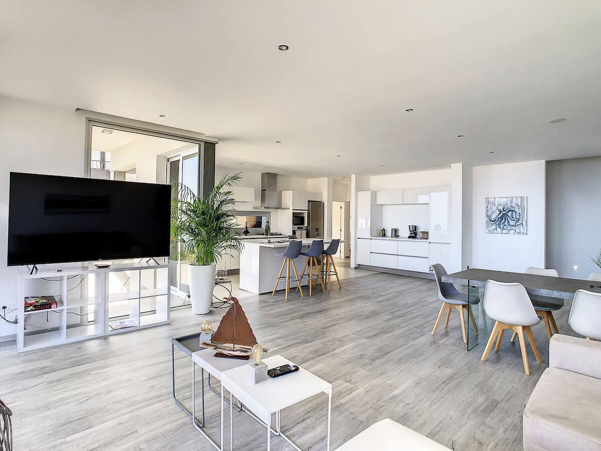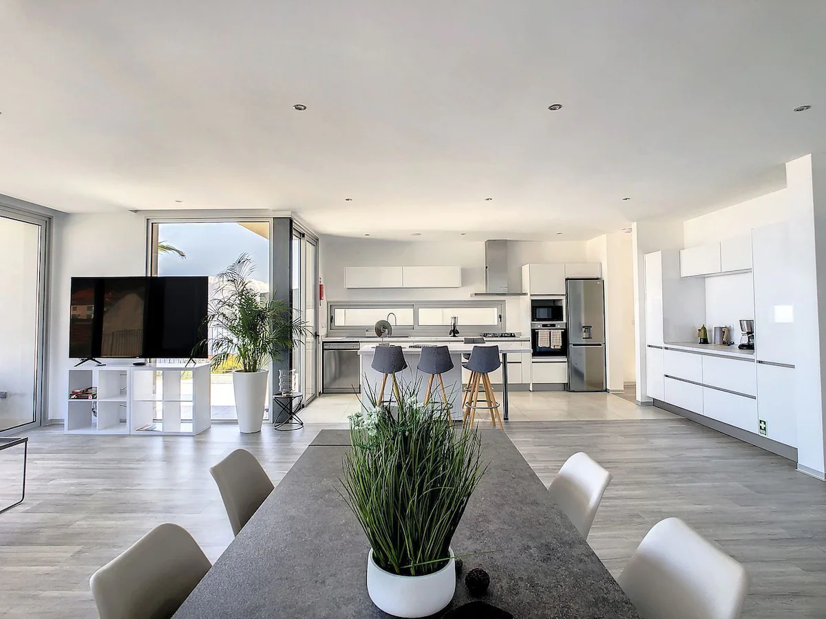 Uma sala espaçosa que proporciona uma luminosidade imensa, como pode ver nas fotos. Neste espaço também se encontra a sala de jantar e a cozinha, que no centro tem uma bancada central para o ajudar com o pequeno-almoço ou o jantar.
